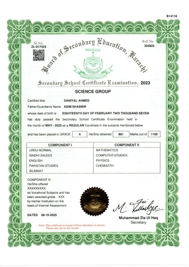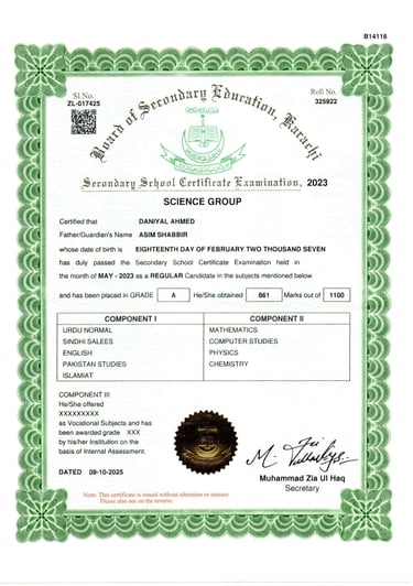 I completed my Secondary School Certificate (SSC) in the Science Group, where I studied core subjects including Physics, Chemistry, Mathematics, and Computer Science.