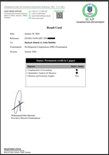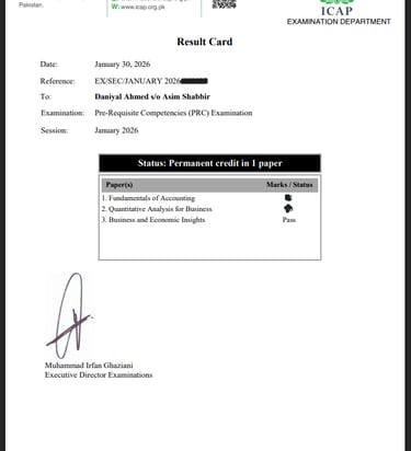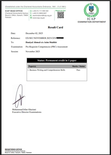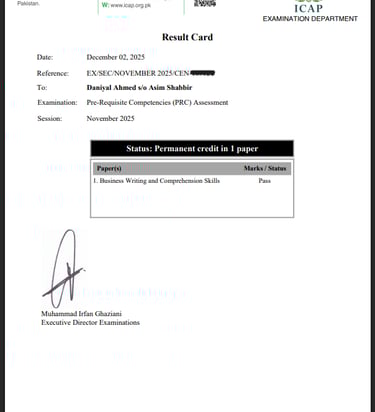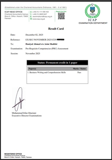 I have successfully passed the Business Writing and Comprehension Skills (PRC) paper from ICAP, which enhanced my professional communication, report writing, and comprehension abilities. This achievement strengthened my ability to present financial and business information clearly, supporting both my academic studies and practical business experience.