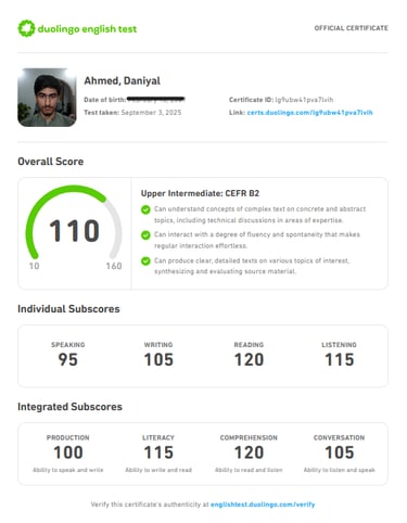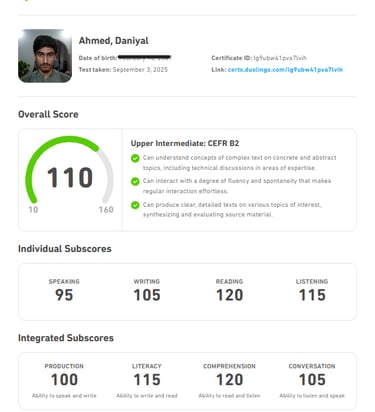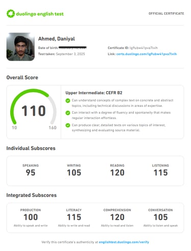 I achieved a score of 110 out of 160 (B2 level) on the Duolingo English Test, which is considered a good score. The Duolingo test is internationally recognized and comparable to IELTS, TOEFL, and PTE Academic, demonstrating my proficiency in reading, writing, listening, and speaking in English.