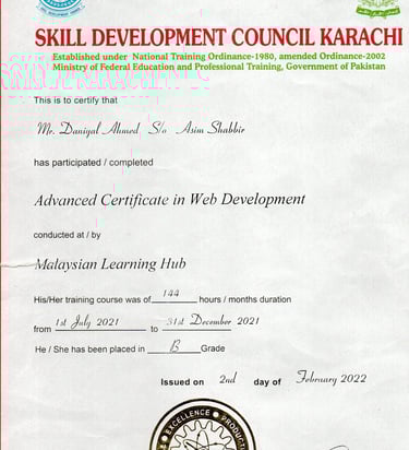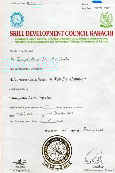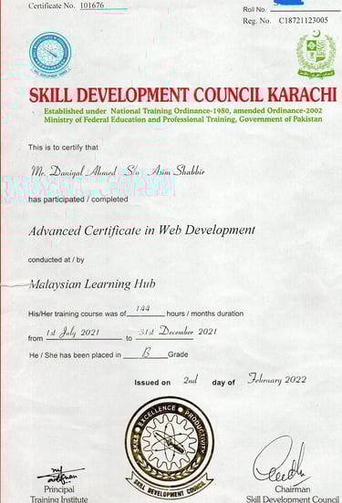 I completed a (DIT) in Web Development in 2021 - 2022 from Malaysian Learning Hub under the Skill Development Council Karachi, Pakistan. This program enhanced my practical skills in web development, strengthening my knowledge of building and managing modern websites and digital projects.