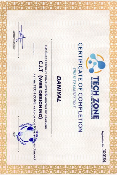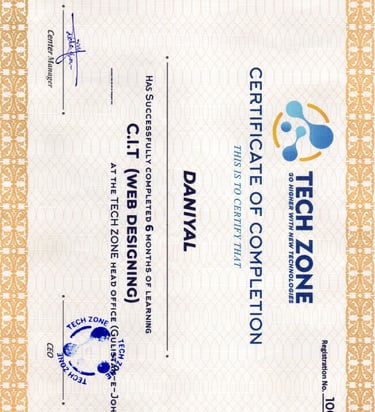 I am certified in Web Designing (CIT), which I completed in 2021 from Tech Zone. They changed their name to Malaysian Learning Hub a registered training institute in Karachi, Pakistan. This certification provided me with foundational skills in web design and digital development, strengthening my ability to create and present online projects professionally.
